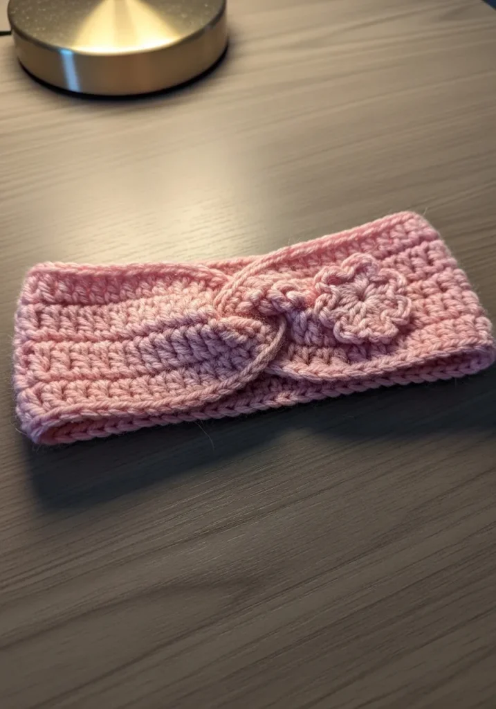 This soft pink crochet ear warmer has a cozy ribbed texture and a twisted front detail that gives it a flattering shape. The yarn looks plush and slightly fuzzy, making it feel warm and comfortable while still lightweight. The soft blush tone keeps it fresh and feminine.