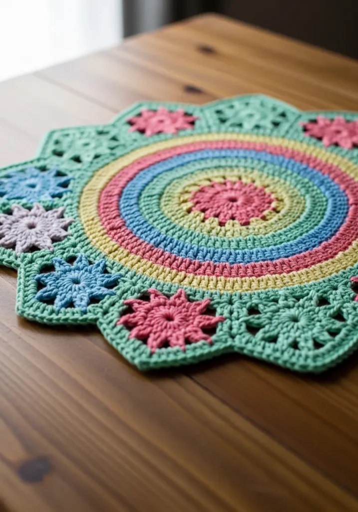 This round crochet mandala mat combines layers of mint, pink, yellow, and turquoise in a beautiful circular design. The textured stitches radiate outward with scalloped edges that add softness to the bold shape. It has a lovely balance of structure and flow.