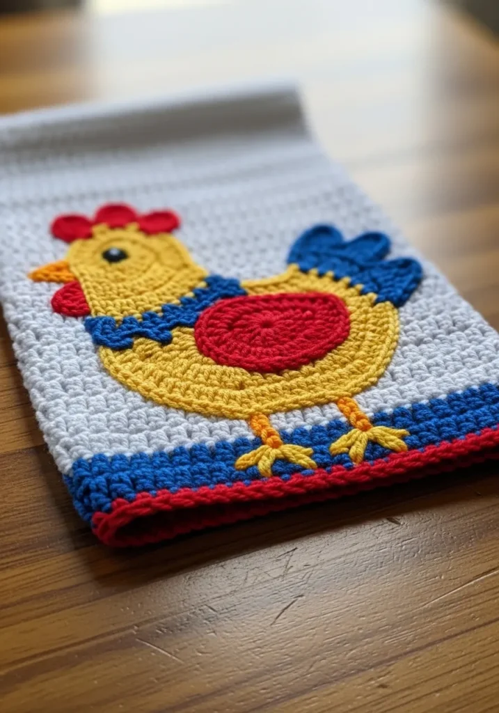 This crochet kitchen towel features a colorful rooster motif in bright red, yellow, and blue stitched onto a soft neutral base. The bottom border has a neat color accent that frames the design beautifully. The stitches are clean and slightly textured, giving it that handmade charm.