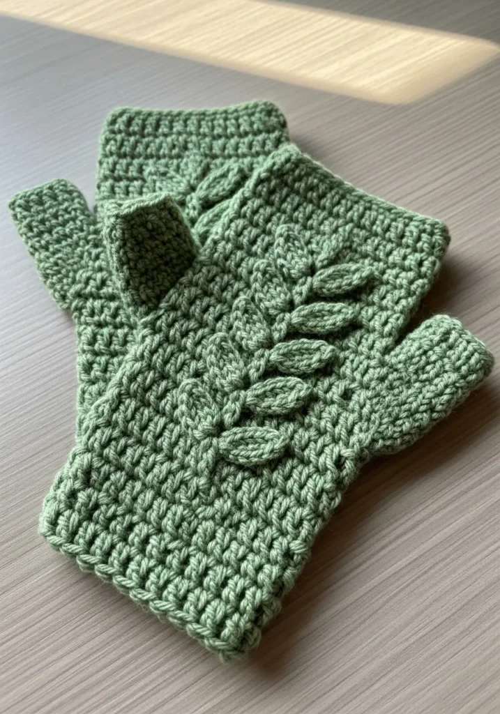 These crochet fingerless gloves are made in a soft sage green with raised leaf stitch details running along the back of the hand. The ribbed cuff adds structure while the textured pattern gives them a cozy yet stylish look. The yarn appears warm and slightly plush.