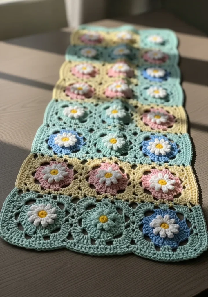 This crochet table runner is made from soft granny squares in muted mint, butter yellow, blush pink, and baby blue, each square featuring a raised daisy motif at the center. The floral clusters create a sweet garden inspired pattern, while the joining stitches form a delicate lace effect between each block. The cotton yarn looks slightly textured and cozy, giving the whole piece that relaxed handmade charm.