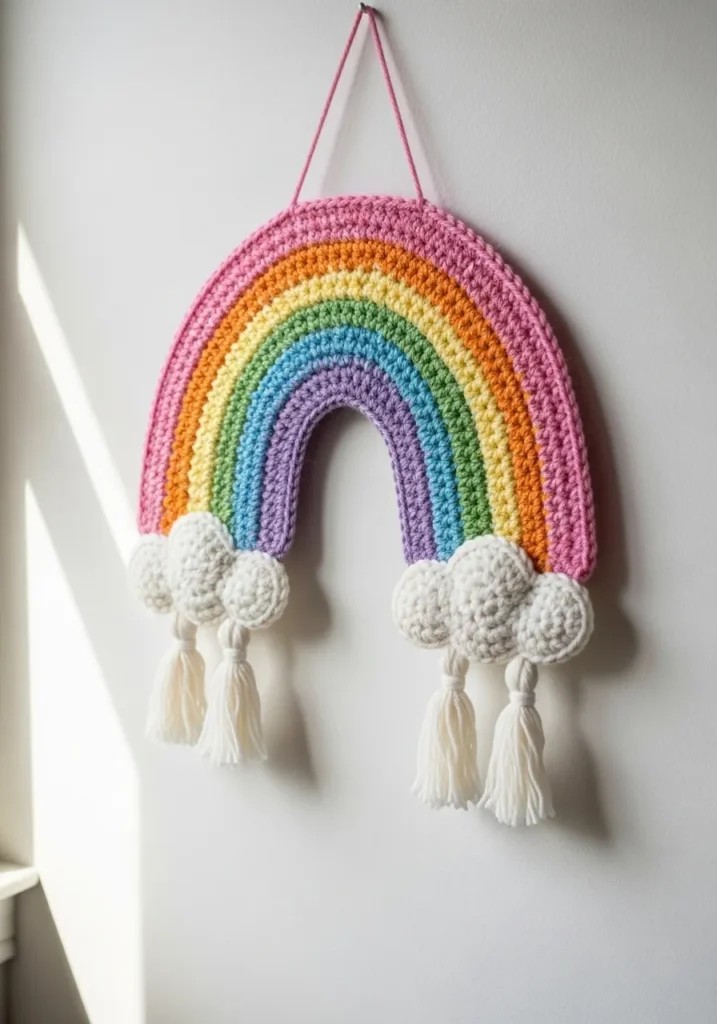 This crochet rainbow wall hanging features bright, cheerful stripes in pink, orange, yellow, green, and blue, all curved into a soft arch shape. Fluffy white cloud puffs sit at the base with tassels hanging down, adding movement and texture. The stitches are clean and slightly chunky, which makes the colors pop beautifully against a neutral wall.