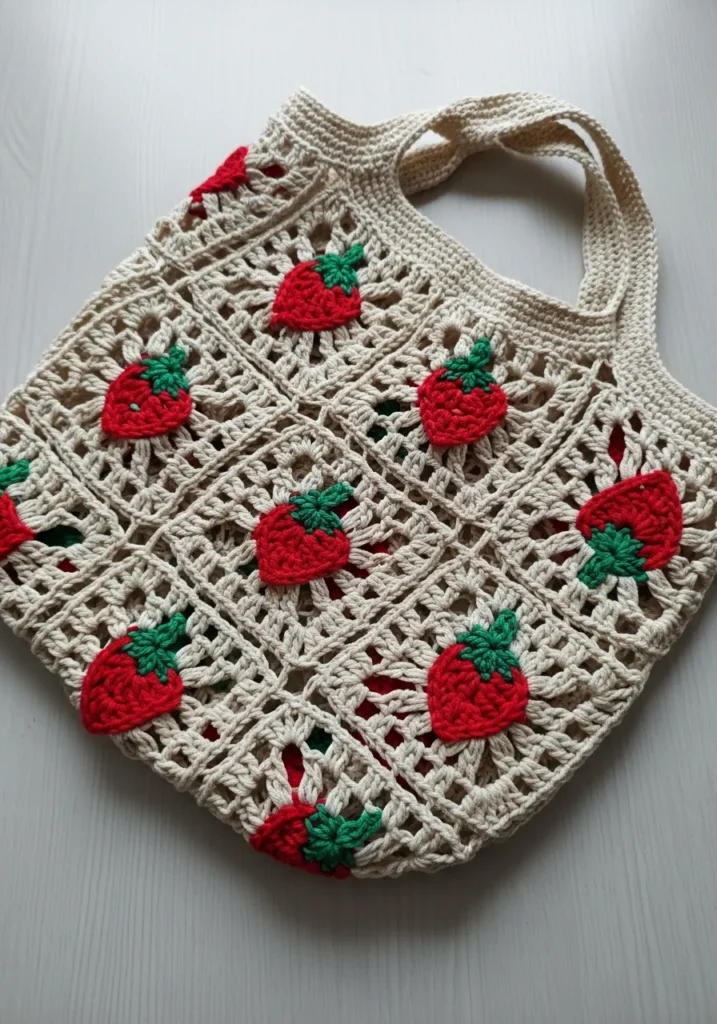 This crochet tote bag is made with cream granny squares decorated with bold red strawberry motifs and leafy green tops. The openwork background keeps it light and breezy while the structured handles give it a practical shape. The bright fruit details pop beautifully against the neutral base.