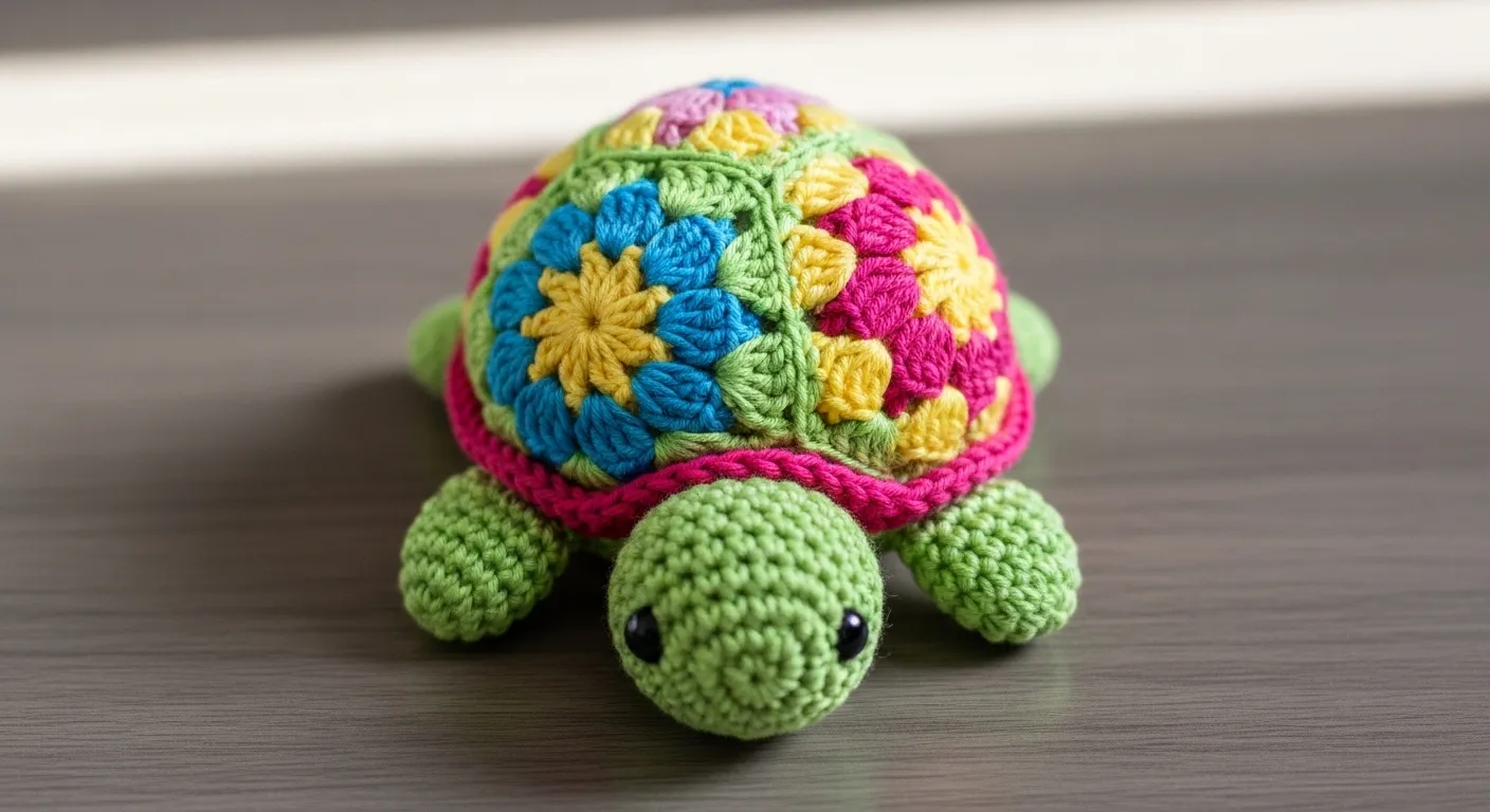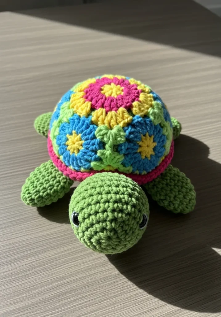 This adorable crochet turtle features a soft green body with a vibrant flower inspired shell in pink, yellow, and blue. The shell is made of colorful granny style motifs stitched together, giving it a playful patchwork look. The rounded shape and glossy safety eyes make it irresistibly sweet.