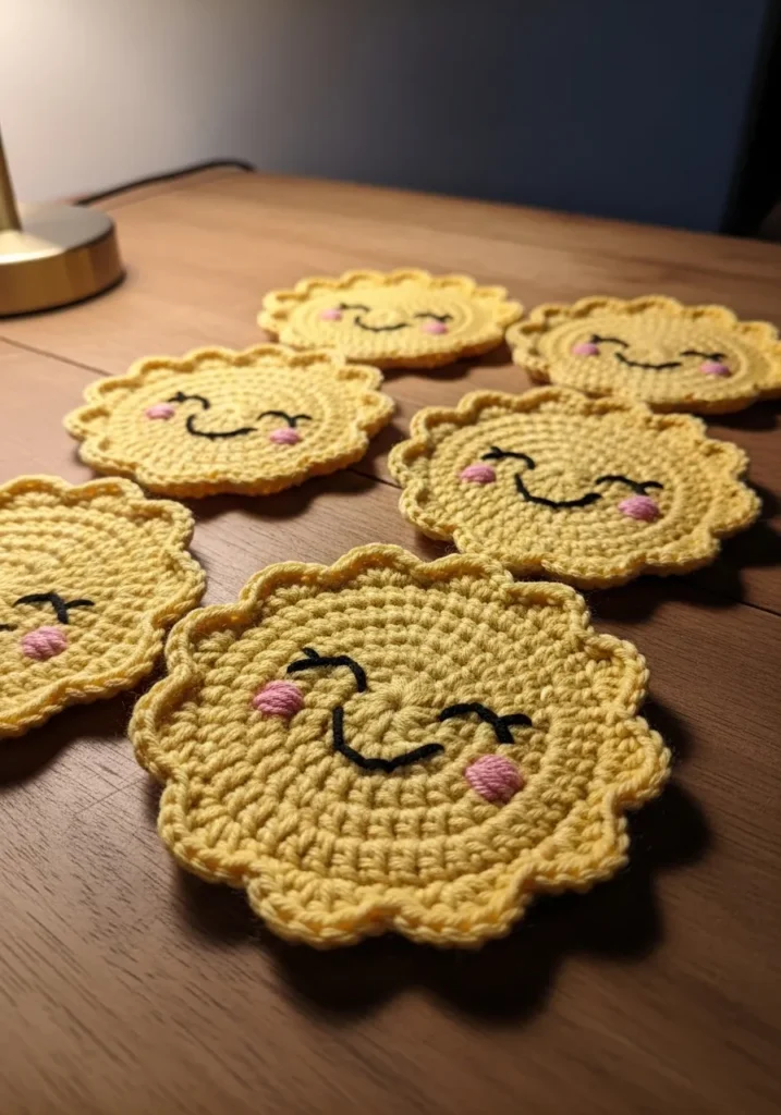 These crochet coasters are shaped like happy little suns in warm yellow yarn with stitched smiling faces and tiny pink cheeks. The round textured stitches create a slightly raised surface while the scalloped edges mimic soft sun rays. They feel bright and playful without being complicated.