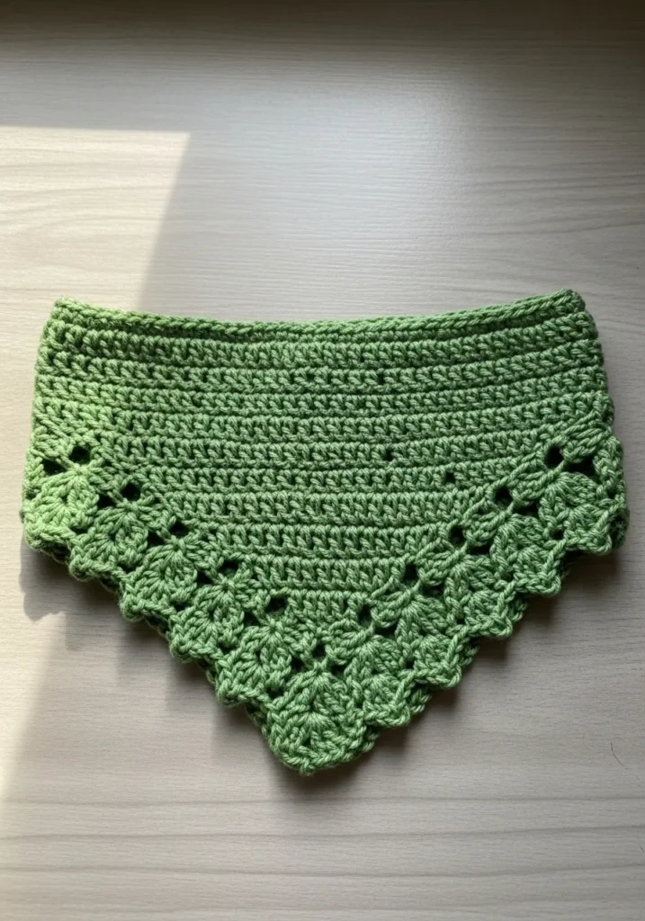This crochet bandana is worked in a soft sage green with delicate openwork stitches and a scalloped edge. The triangular shape drapes naturally and the airy texture keeps it light and breathable. It feels modern and minimal with just enough detail to stand out.
