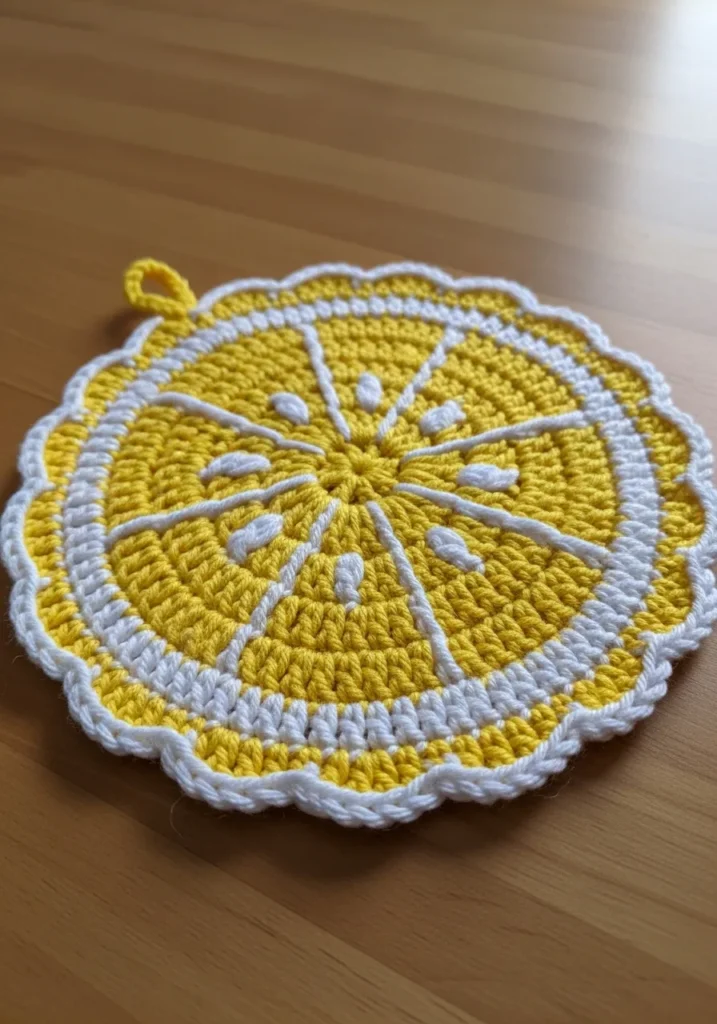 This crochet trivet is designed like a bright lemon slice with bold yellow segments and crisp white detailing. The round shape and textured stitches highlight the citrus pattern beautifully. It looks cheerful and summery while still being sturdy enough for hot dishes.