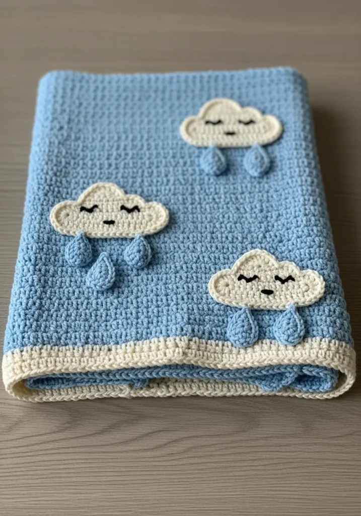 This soft blue crochet blanket features tiny cloud appliqués with sweet embroidered faces and small dangling raindrops. The base is simple and smooth, allowing the clouds to stand out with gentle dimension. The color palette feels calm and soothing.