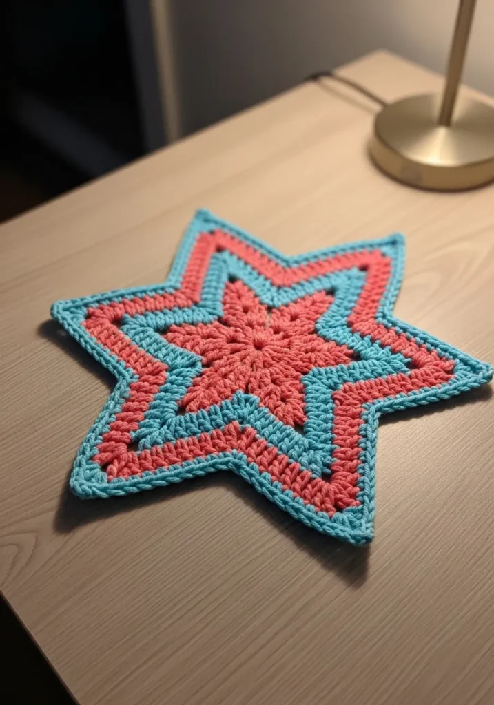 This crochet mat is shaped like a bold starburst in coral and turquoise tones with layered textured stitches radiating from the center. The pointed edges give it a playful geometric feel while the color contrast keeps it lively. It feels vibrant and modern.