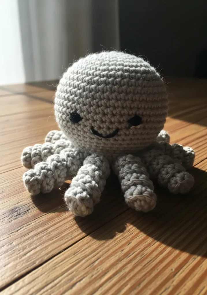 This sweet little crochet octopus is made with soft beige yarn and tightly stitched amigurumi rounds that give it a smooth, rounded head and adorable curled tentacles. The texture is slightly nubby from the stitches, which adds that handmade charm I always look for. Its tiny embroidered eyes and subtle smile make it feel calm and cuddly, while the compact size makes it perfect for a small shelf or bedside table. The neutral tone keeps it cozy and versatile, especially against the warm wooden surface.