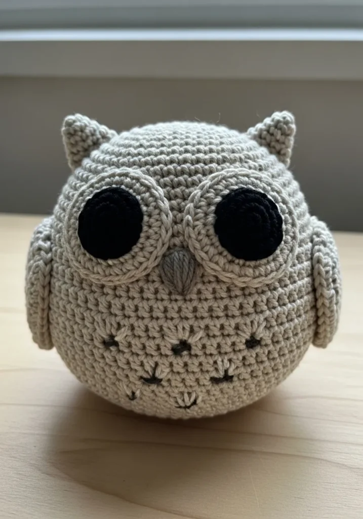 This crochet owl has a rounded body in soft neutral yarn with oversized black eyes that instantly grab attention. The stitched feather details and tiny beak give it a sweet, slightly curious expression. The compact shape and even stitching make it look neat yet cozy. It feels sturdy but still soft to the touch.