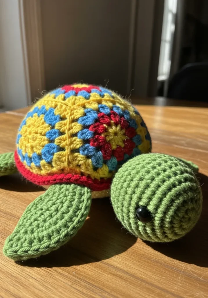 This vibrant crochet turtle combines a classic green body with a colorful granny square shell made in bright pink, yellow, blue, and green. The shell’s textured stitches create a bold pattern that stands out beautifully against the smooth green head and flippers. The mix of traditional granny square technique with amigurumi shaping makes it feel fresh and creative.