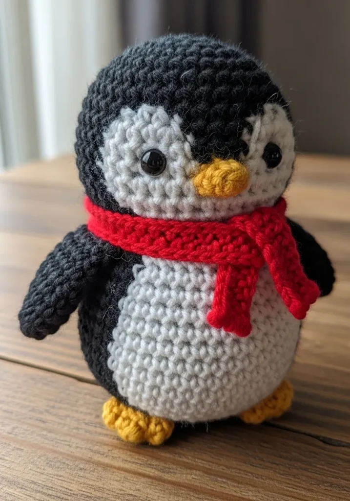 This crochet penguin features a classic black and white body with tiny yellow feet and beak that brighten up the design. Wrapped around its neck is a bold red scarf that instantly adds a cozy winter vibe. The rounded shape and neat stitching make it look sturdy yet soft, and the small wings rest gently at its sides for a balanced silhouette.