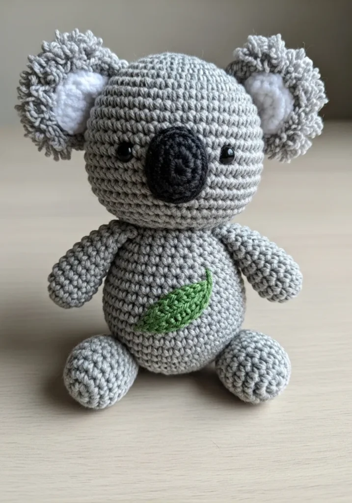 This crochet koala is crafted in soft gray yarn with fluffy textured ears and a darker rounded nose that stands out beautifully against its face. A tiny green leaf detail stitched onto its belly ties into its natural theme. The body is compact and slightly rounded, giving it that adorable baby animal look that is hard to resist.