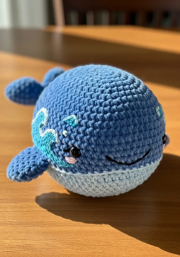 This cheerful crochet whale is made in soft blue yarn with a white belly and tiny embroidered details that resemble little water droplets. Its round, plush body and small fins give it a squishy, cuddly look. The stitches are consistent and slightly textured, adding that handmade warmth we all love. The simple color combo keeps it fresh and playful.