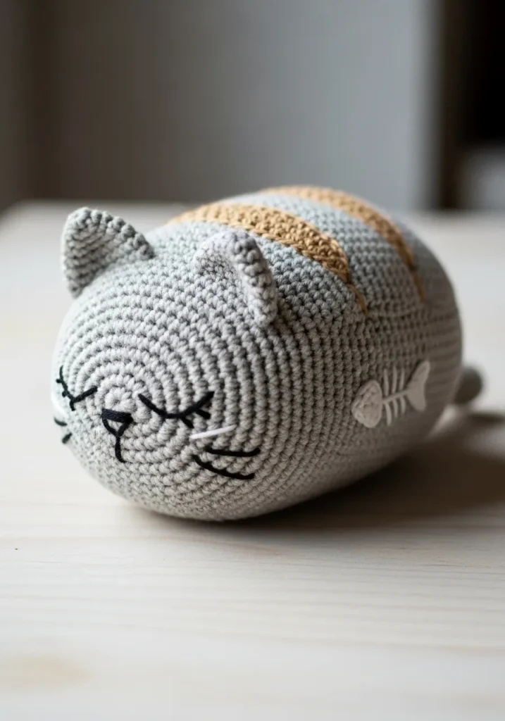 This crochet cat is shaped like a cozy little loaf with its paws tucked underneath its rounded body. The soft gray yarn and minimal stitched face details give it a calm, sleepy vibe. A tiny fish bone detail on the side adds a playful touch without overwhelming the design. The texture is slightly plush and inviting, perfect for a cozy setting.