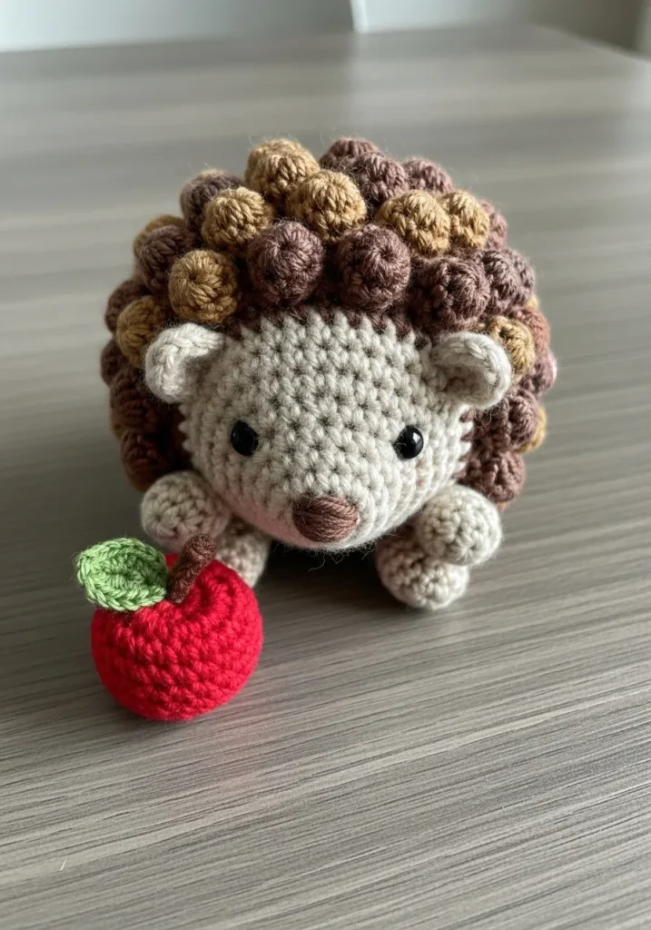 This charming crochet hedgehog features a soft beige body and textured brown bobble stitches forming its spiky back. Its tiny black eyes and rosy cheeks make it look extra sweet. The little red crochet apple in its paw adds a bright, playful accent. The mix of smooth and textured stitches gives it beautiful dimension.