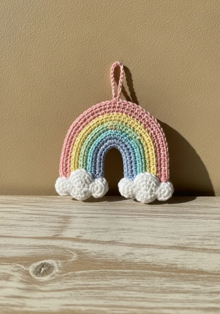 This charming crochet rainbow features gentle pastel shades layered in a smooth arch. Soft pink, muted yellow, light green, and pale blue flow beautifully together. Fluffy white cloud shapes sit at the base, giving it a dreamy finish. A small loop at the top makes it easy to hang on a wall or hook.