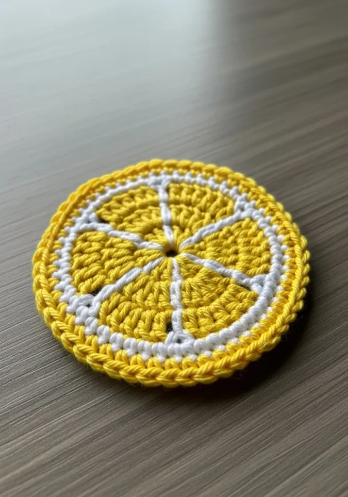 This crochet lemon slice is bright and cheerful with its sunny yellow sections outlined in crisp white yarn. The circular shape is divided into neat segments that mimic the look of a freshly cut lemon. The outer edge has a slightly thicker border that gives it structure and definition. The texture is smooth yet detailed enough to stand out.