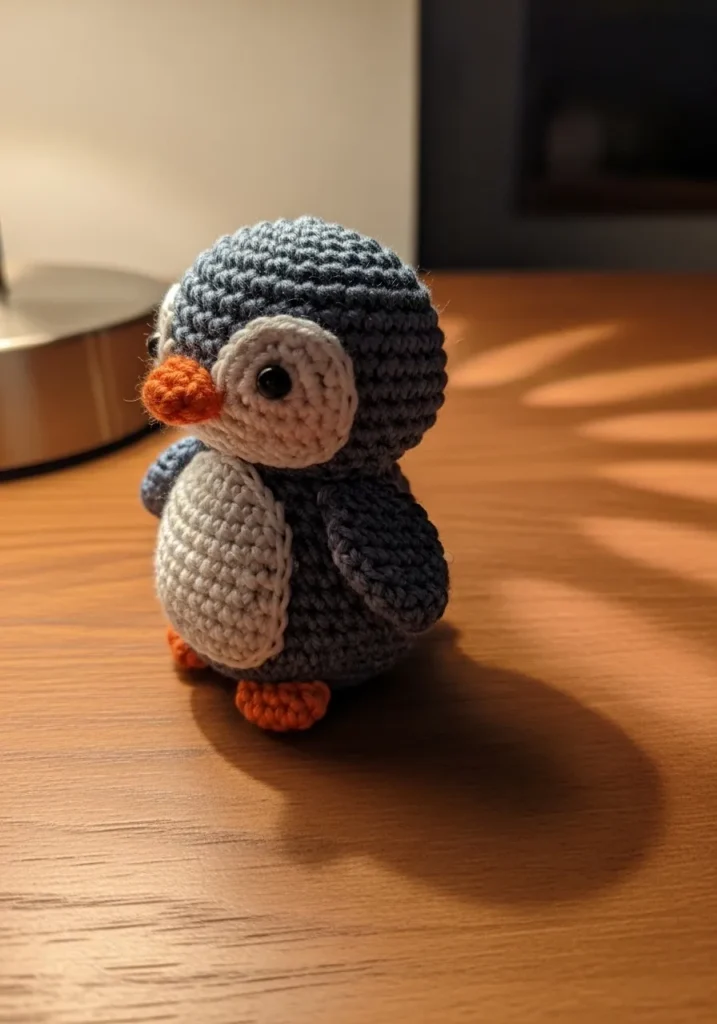 This tiny crochet penguin is absolutely heart melting. Its body is worked in soft gray and white yarn with a rounded shape that makes it extra cuddly looking. The small orange beak and matching feet add a sweet pop of color. The simple stitched eyes give it a gentle and friendly personality.