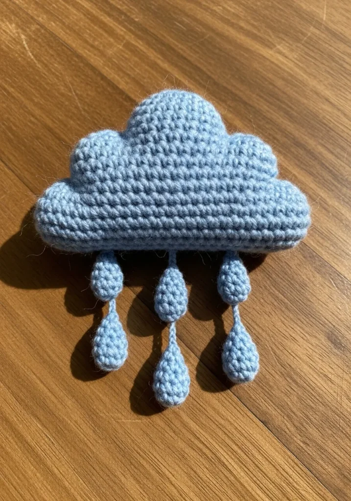 This sweet little crochet cloud is worked in a gentle sky blue yarn with a puffy rounded shape. Hanging below are four small raindrops stitched in the same shade, each dangling neatly to create movement and dimension. The texture is smooth and tight, giving the cloud a plush and polished look. Its simple silhouette makes it both modern and whimsical.