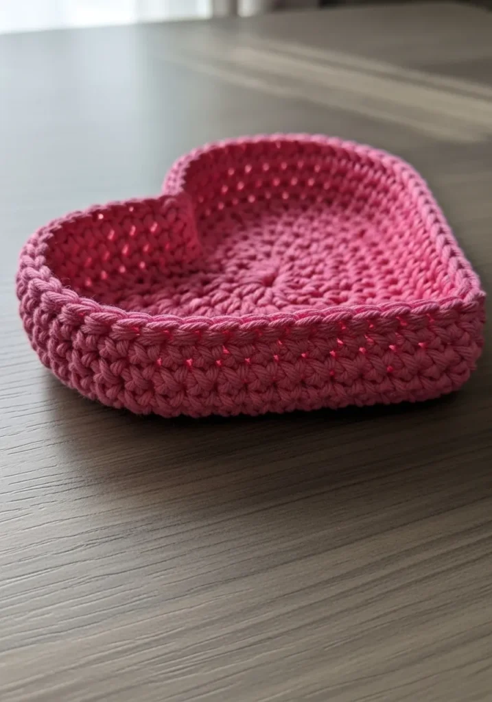 This charming crochet heart dish is made in a vibrant pink yarn with thick, sturdy stitches that help it hold its shape. The raised edges create a shallow bowl that is perfect for holding rings or tiny trinkets. The smooth curves of the heart give it a soft and romantic feel. Its texture is cozy but structured, making it both decorative and practical.
