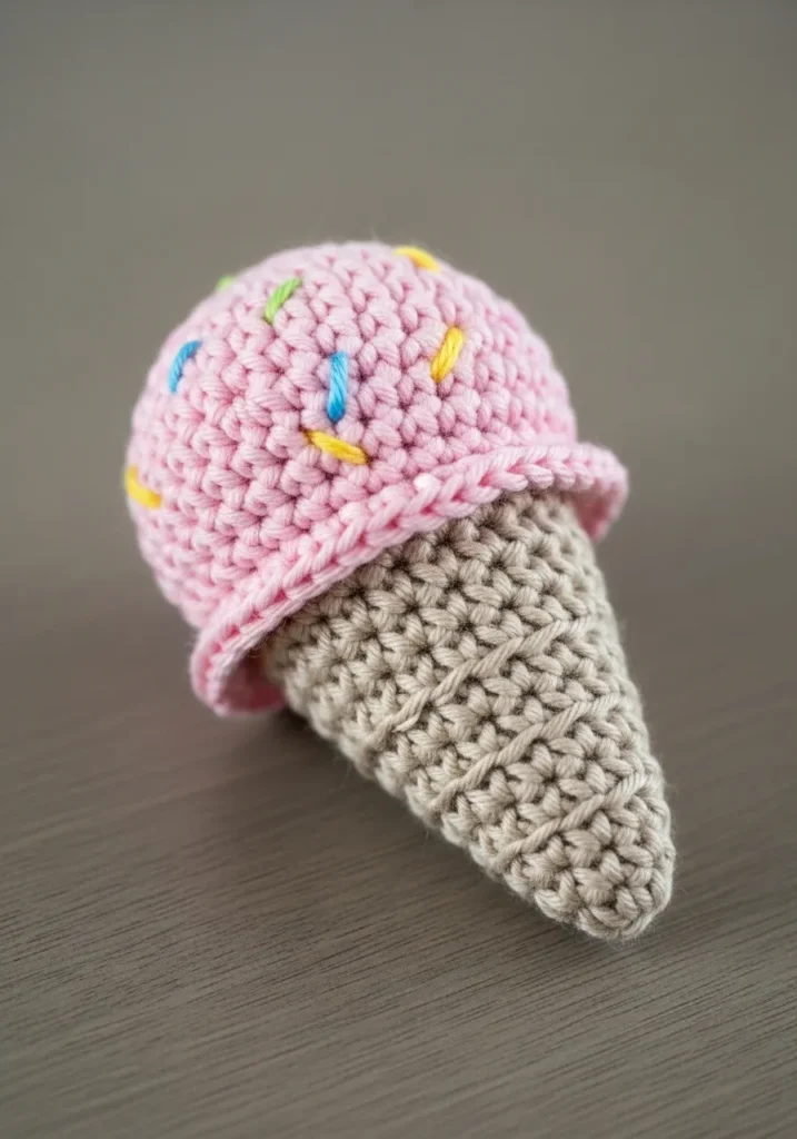 This adorable crochet ice cream cone features a soft beige waffle cone stitched with a subtle textured pattern. On top sits a rounded scoop of pastel pink yarn decorated with tiny colorful sprinkle stitches. The contrast between the neutral cone and the playful sprinkles makes it feel bright and fun. The stitches are tight and even, giving it that classic amigurumi finish.