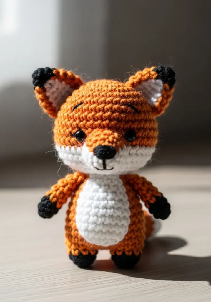 This tiny crochet fox is full of woodland charm. It is stitched in a warm orange yarn with crisp white details on the belly and face. The black tips on the ears and feet add contrast and definition, while the small stitched nose and shiny eyes give it a sweet and curious expression. The rounded body and slightly oversized head create that classic amigurumi look that feels soft and cuddly.