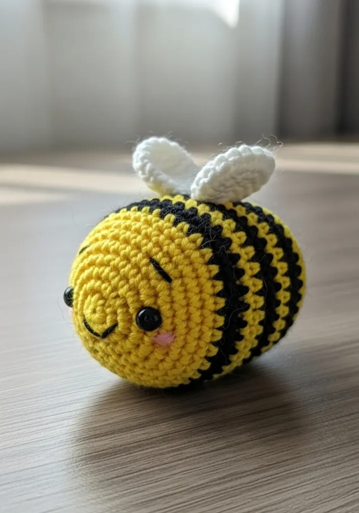 This happy little crochet bumblebee is stitched in bright yellow and bold black stripes that instantly catch the eye. The rounded body is slightly plush, giving it a soft and squishy feel. Two small white wings sit neatly on top, and the tiny stitched smile makes it look extra friendly. The clean, tight stitches give it a polished finish while still keeping that cozy handmade vibe.