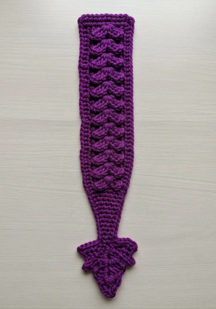 This elegant crochet bookmark is worked in a rich purple yarn with a repeating textured stitch pattern that runs vertically down its length. The design is long and slim, finished with a decorative pointed tip that adds a little flourish. The stitch definition stands out beautifully in this bold color, giving it a refined yet cozy look.