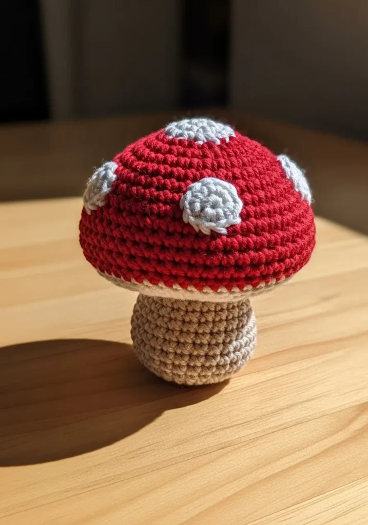 This tiny crochet mushroom is full of woodland charm. The cap is stitched in a bright red with small white circular spots, while the stem is worked in a soft neutral beige. The rounded cap sits neatly on the sturdy stem, and the tight stitches give it a smooth and slightly squishy texture. The color combination instantly gives it that classic storybook look.