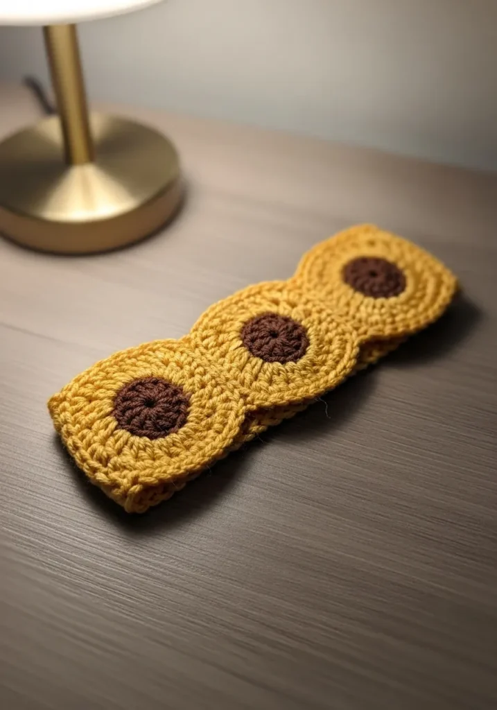 This fun little crochet piece looks like a strip of golden sandwich cookies lined up in a row. The base is worked in a warm mustard yellow yarn with three round chocolate brown circles stitched neatly across the center. The texture is slightly bumpy and cozy, giving it that soft handmade charm. Its rectangular shape makes it feel like a quirky coaster, small mat, or even a playful decorative accent for a desk.