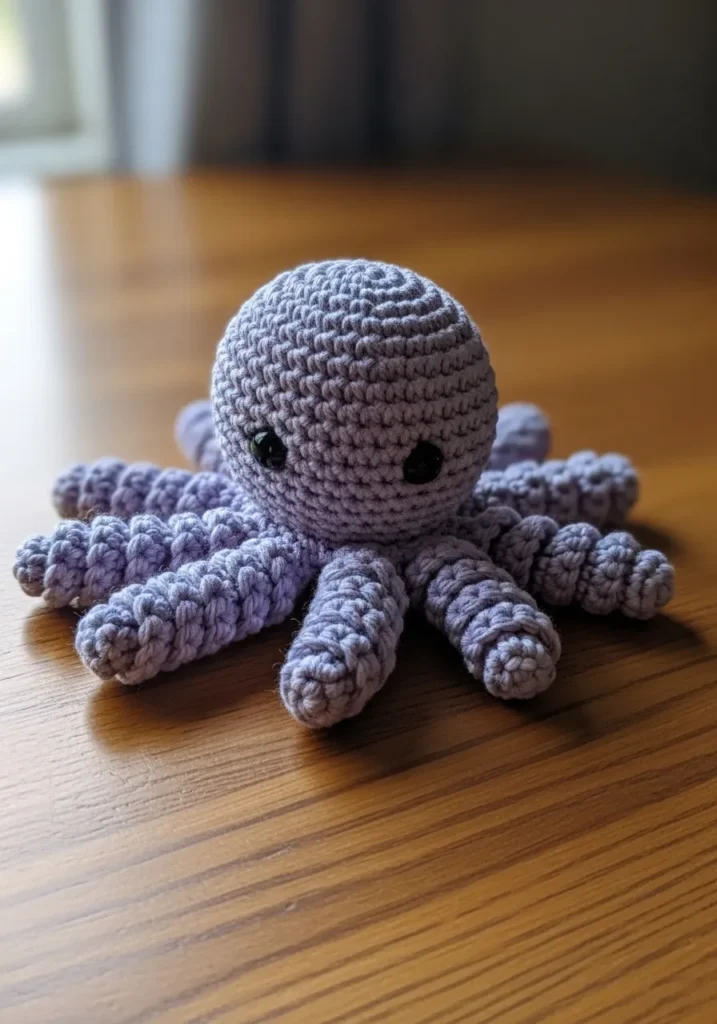 This adorable crochet octopus is made in a soft lavender yarn with a smooth, rounded head and eight curly little tentacles. The stitches are tight and even, giving it that classic amigurumi look. Two tiny black eyes bring it to life and give it the sweetest expression. The gentle pastel color makes it feel calm and comforting.