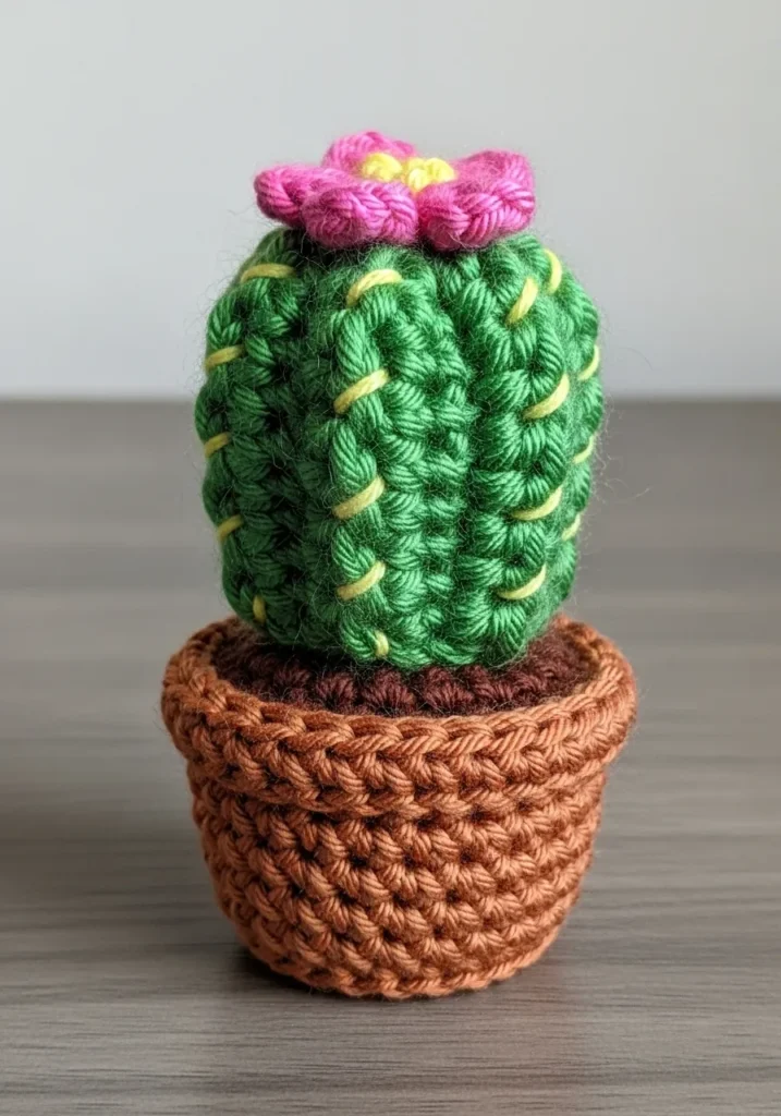 This tiny crochet cactus is full of desert charm. The cactus body is stitched in a vibrant green with raised vertical ridges that mimic the look of a real cactus. A small pop of bright pink flowers sits on top, adding a playful contrast. The brown crochet pot has a sturdy texture that balances the softness of the cactus itself.