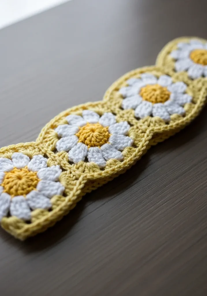 This charming crochet headband features a row of soft white daisies with sunny yellow centers, all connected by a gentle pastel base. Each flower is slightly raised, creating a lovely textured strip that feels delicate yet sturdy. The repeated floral motif gives it a cohesive look, while the soft yarn keeps it comfortable for everyday wear. The scalloped edges add a sweet handmade touch that makes the design stand out.