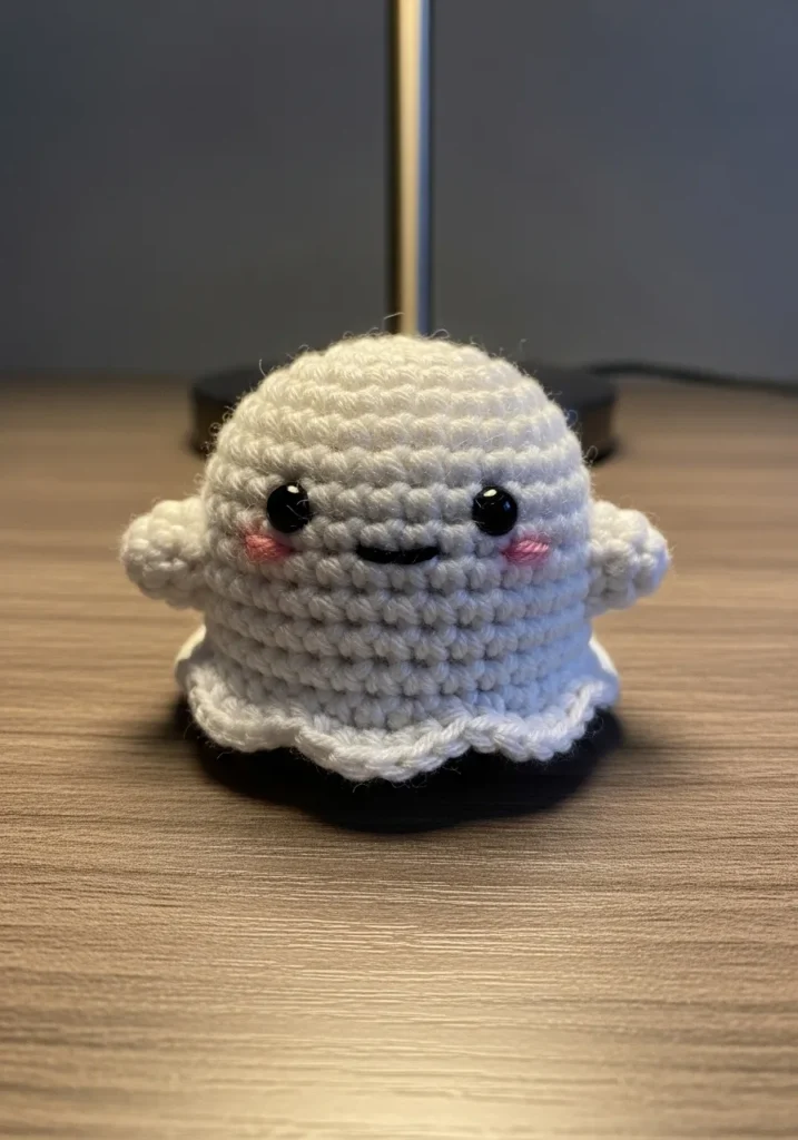 This tiny crochet ghost is worked in soft white yarn with tight, even stitches that give it a smooth and rounded shape. The scalloped bottom edge adds a playful floating effect, while the small black eyes and rosy pink cheeks bring it to life. Its compact, slightly stuffed body keeps it upright and perfectly squishy at the same time. The simple design makes the texture stand out, especially under warm light.