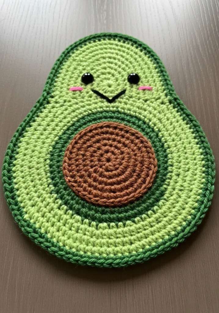 This cheerful crochet avocado is made with layered shades of green and a warm brown center to mimic the pit. The oval shape is neatly defined with smooth increases that create a clean outline. A tiny stitched smile and rosy cheeks add a sweet, friendly expression. The yarn texture is soft but firm enough to function as a coaster or small decorative mat.