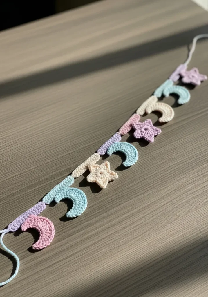 This whimsical crochet garland features a row of small crescent moons and star shapes in soft pastel shades. Each motif is carefully stitched and joined with a simple chain strand that keeps the design light and flexible. The gentle pinks, blues, and creams create a dreamy color palette that feels calm and cozy. The stitches are neat and slightly textured, giving the garland a handcrafted charm.