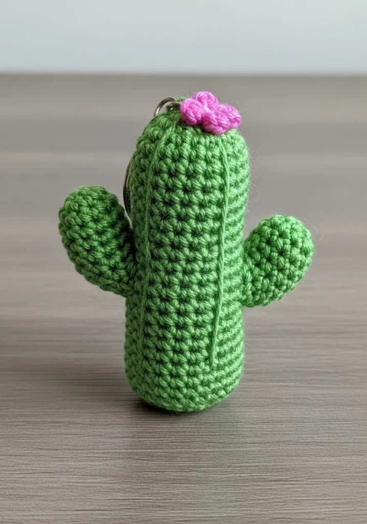 This adorable little crochet cactus is stitched in soft green yarn with tight, even rows that give it that classic amigurumi look. The rounded body features two small arms and subtle ribbing that mimics a real cactus shape. On top sits a tiny pink flower, adding the sweetest pop of contrast. The stuffing keeps it firm and upright, making it perfect for displaying on a desk or shelf without needing a real plant pot or sunlight.