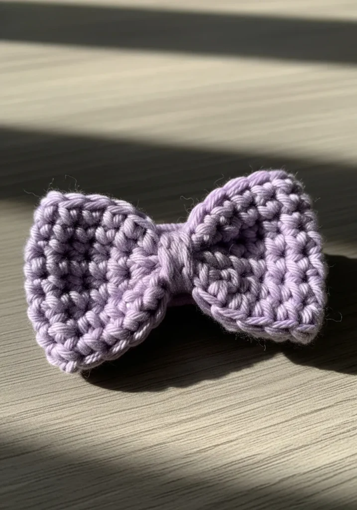 This sweet crochet bow is stitched in a soft lavender yarn with a thick, slightly textured finish. The bow shape is created by gathering the center, which gives it those classic rounded loops on each side. The stitches are tight and even, helping it hold its form beautifully. Its compact size makes it ideal for attaching to a hair clip or headband for an adorable accessory.