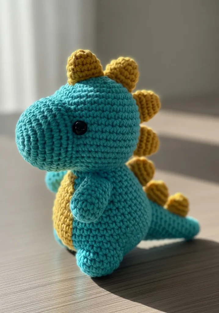 This adorable little dinosaur is stitched in a bright teal yarn with small yellow spikes running down its back. The rounded body and short legs give it a friendly, cuddly shape. Tiny black eyes add a sweet expression, while the smooth stitches keep everything looking polished. The contrasting spikes bring just the right amount of playful detail.