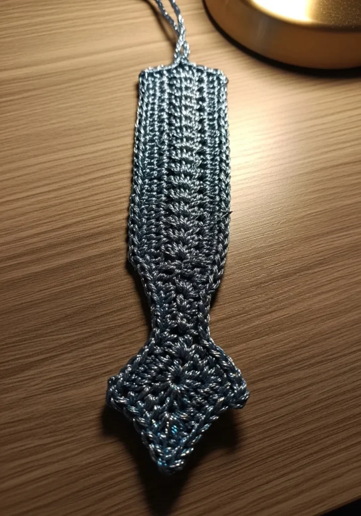 This slim crochet bookmark is worked in a cool toned gray yarn with a beautifully textured stitch pattern running from top to bottom. The design tapers slightly near the end and finishes with a subtle pointed tip that gives it a polished look. The tight stitching keeps it flat and sturdy, while the soft yarn ensures it will not damage book pages. A small loop at the top makes it easy to slip in and out of your favorite reads.