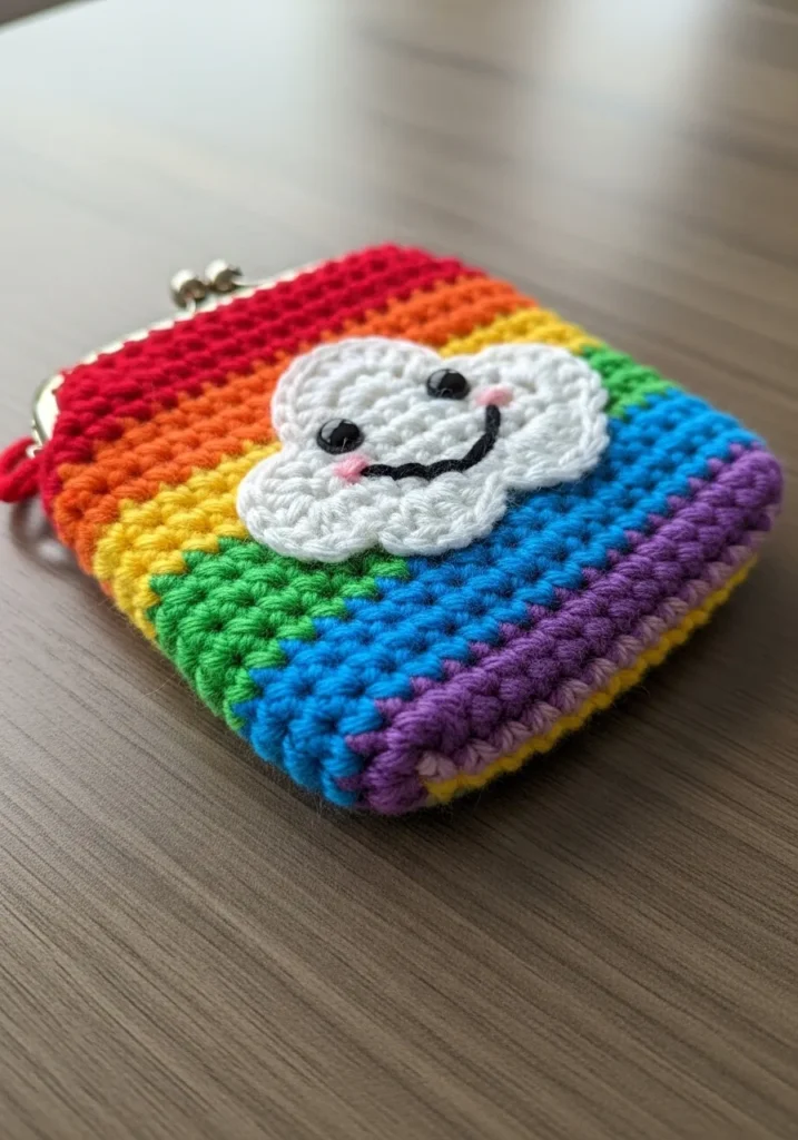 This cheerful crochet coin pouch is stitched in bold rainbow stripes with bright red, orange, yellow, green, blue, and purple rows. On the front sits a puffy white cloud with a sweet stitched smile, adding a playful character detail. The compact rectangular shape makes it perfect for holding coins, earbuds, or small essentials. A secure zipper closure keeps everything tucked safely inside.