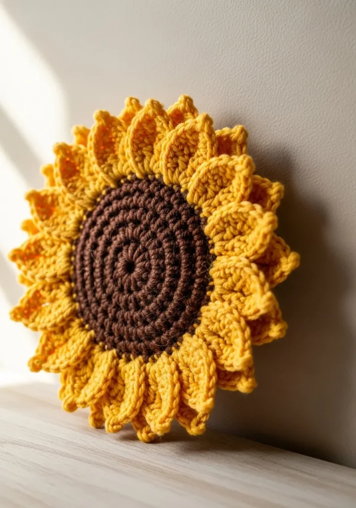 I absolutely adore projects like this because they make such a statement with minimal effort. The petal rounds are repetitive in the best way, which makes it a relaxing and quick finish. It feels so satisfying to watch the flower bloom row by row in your hands. If you want instant sunshine in your space, this one delivers big happy energy fast.