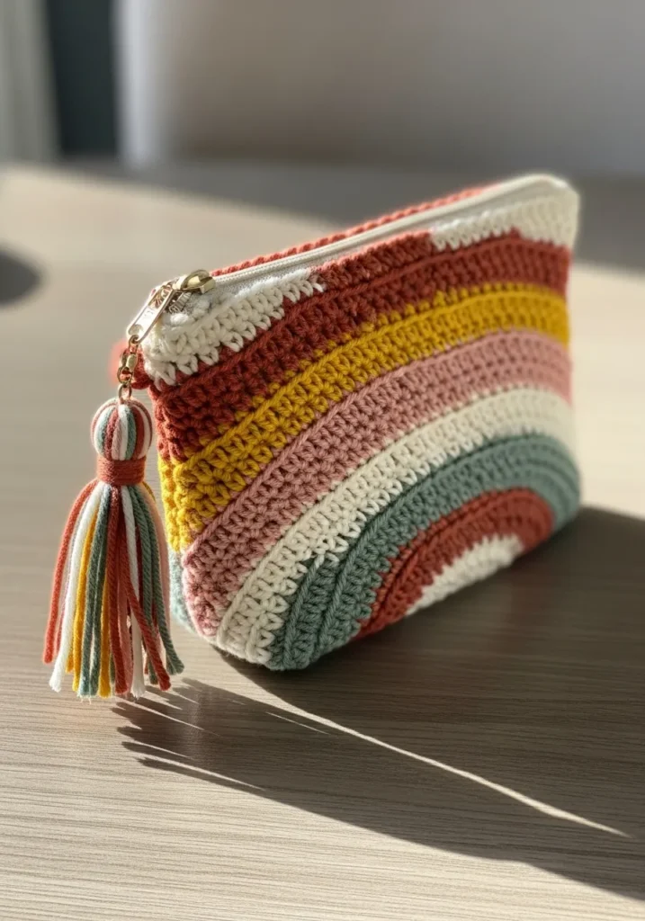 This cheerful crochet pouch is worked in horizontal stripes of soft pastel shades, creating a subtle rainbow effect. The stitches are tight and structured, giving the pouch a sturdy feel. A zipper closure at the top keeps everything secure, and a matching tassel detail adds a fun finishing touch. The blend of colors makes it bright but still wearable.