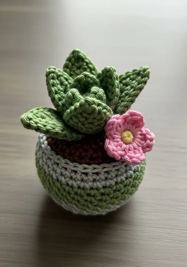 This adorable crochet succulent features plump green leaves stitched in tight rounds to mimic a real plant. It sits snugly inside a small crocheted pot in soft neutral tones, complete with textured brown stitches on top to resemble soil. A tiny pink flower adds a cheerful pop of color. The stitches are neat and compact, giving the whole piece a polished and sturdy finish.