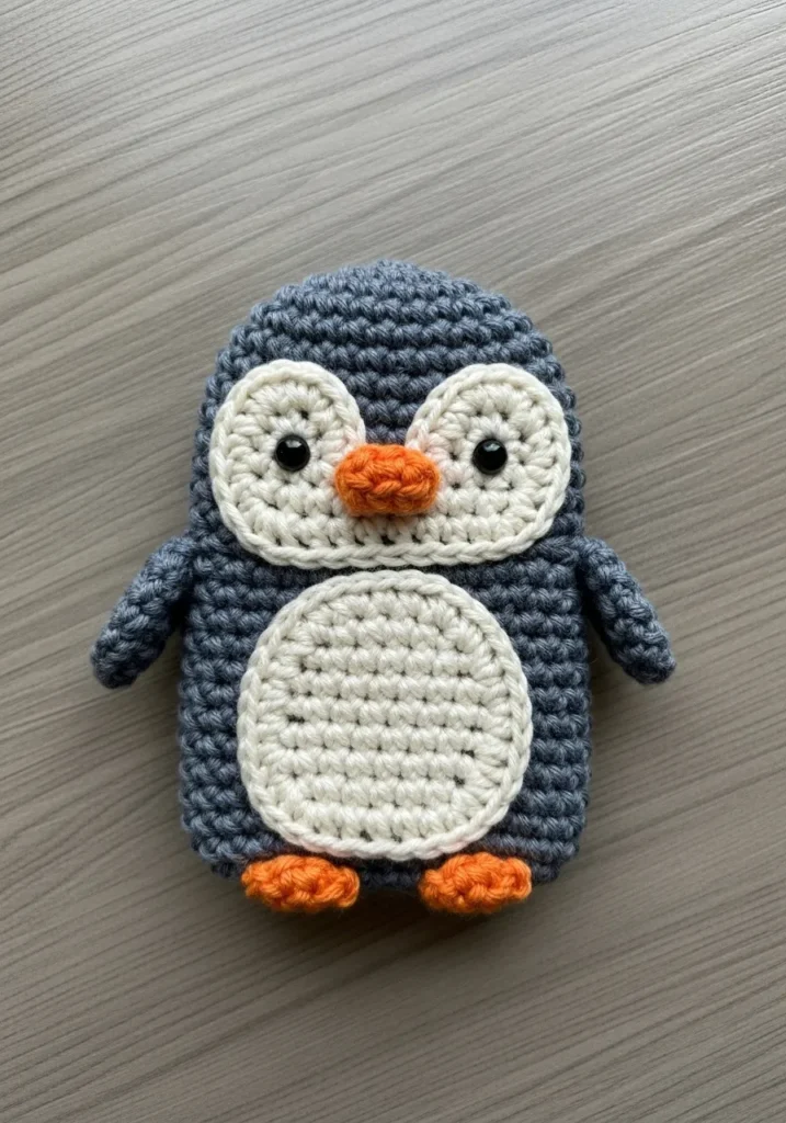 This sweet crochet penguin is stitched in soft gray yarn with a white belly panel and bright orange beak and feet. The body is slightly oval and firmly stuffed for a neat shape. The contrasting colors give it that classic penguin look, and the small embroidered eyes add personality without overwhelming the design. The texture is smooth and tidy, making it look polished.