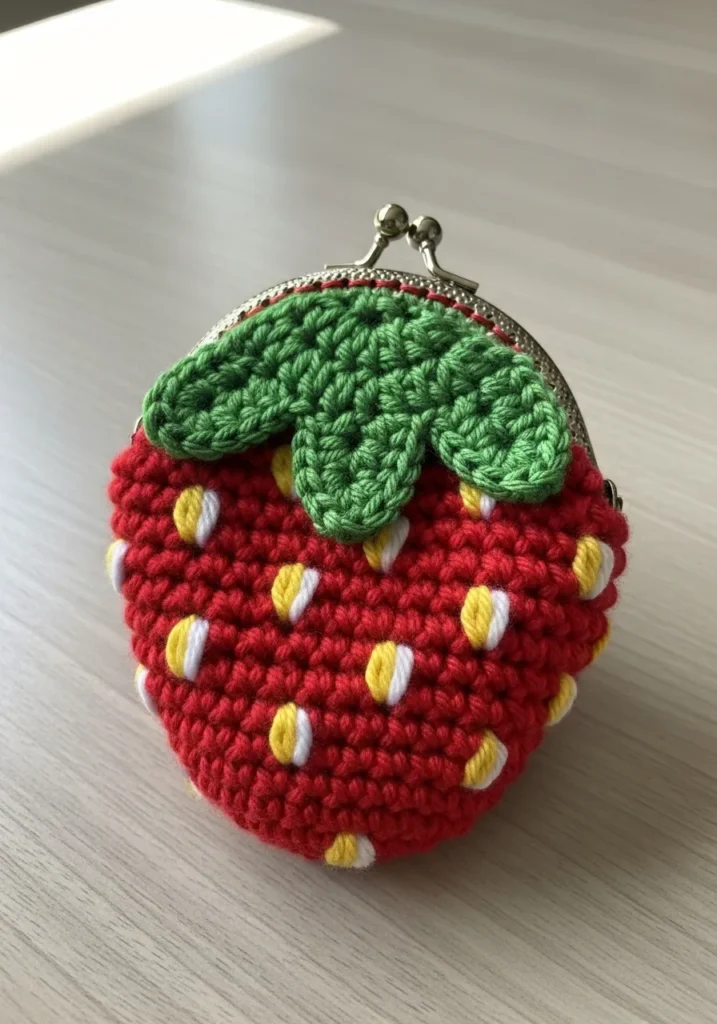 This charming crochet coin purse is shaped like a bright red strawberry, complete with tiny yellow seed stitches and a leafy green top. The body is crocheted in tight, even rounds for a firm structure, and a silver metal clasp at the top adds a vintage touch. The bold red yarn paired with fresh green makes it playful and eye catching.
