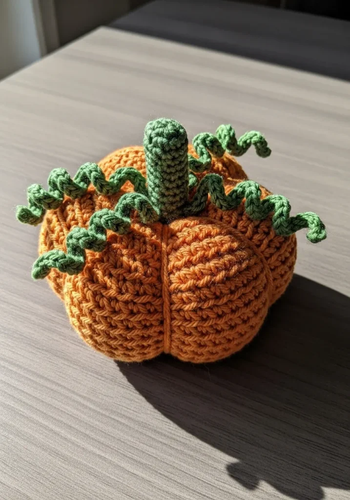 This chunky crochet pumpkin is worked in a warm burnt orange yarn with deep ribbed sections that give it that classic pumpkin shape. The top features a sturdy green stem and curly vine details that add extra character. The tight stitches make it feel firm and structured, while the textured ridges create beautiful shadows in natural light. It has that cozy handmade look that instantly feels like fall.