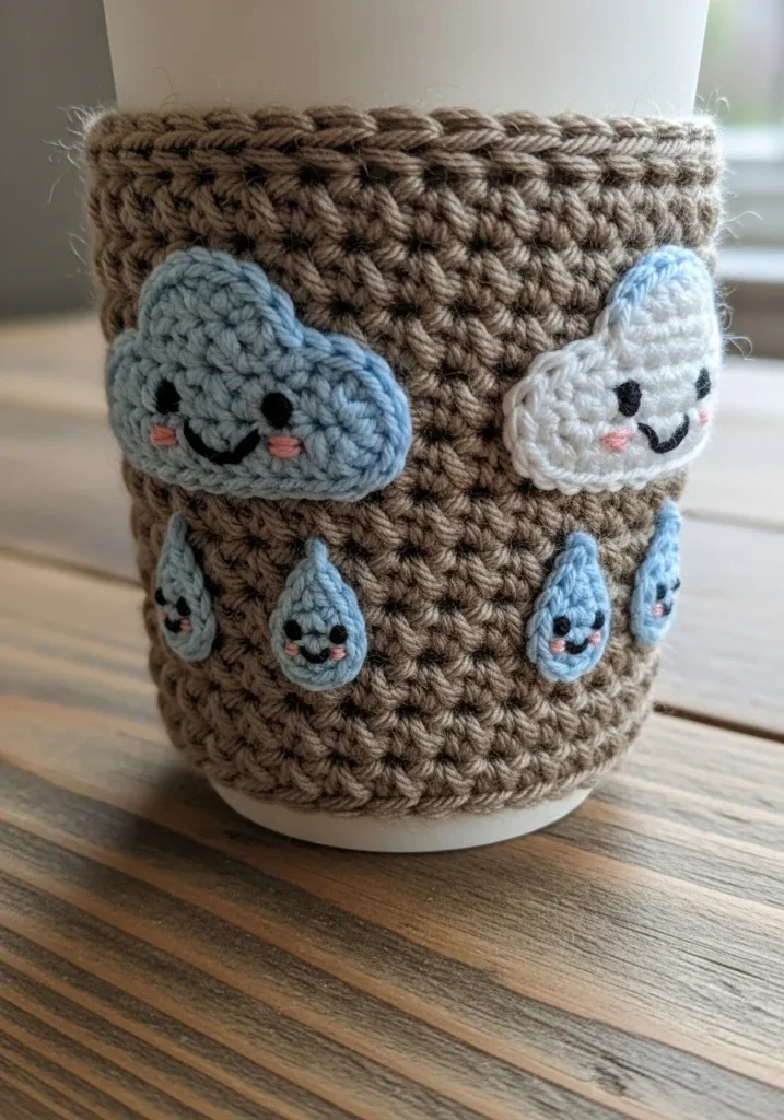This adorable cup cozy is crocheted in a soft beige yarn that wraps snugly around a takeaway cup. Sweet little blue clouds with smiling faces and tiny raindrops are appliquéd onto the surface, giving it a playful personality. The stitches are thick and textured, making it both practical and decorative. The cozy hugs the cup securely while adding a soft handmade touch.